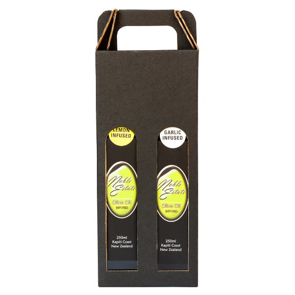 Beautifully presented Gift Box containing 2 x 250ml Lemon & Garlic Infused Olive Oil from Noble Estate and achieve perfection in your cooking from grilled to roast meat, salads, vegetables, pasta and seafood.